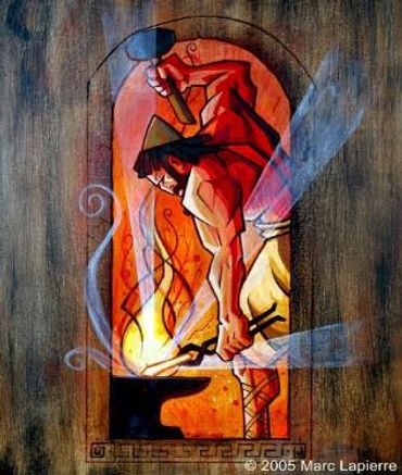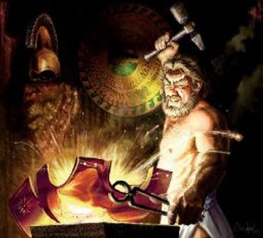 Vulcan is the Roman god of metalworkers and crafters. He forged the armour and weapons of the gods at his workshop in mount Etna. He is known for a firey red beard, his symbol are the anvil, hammer, and tongs.
